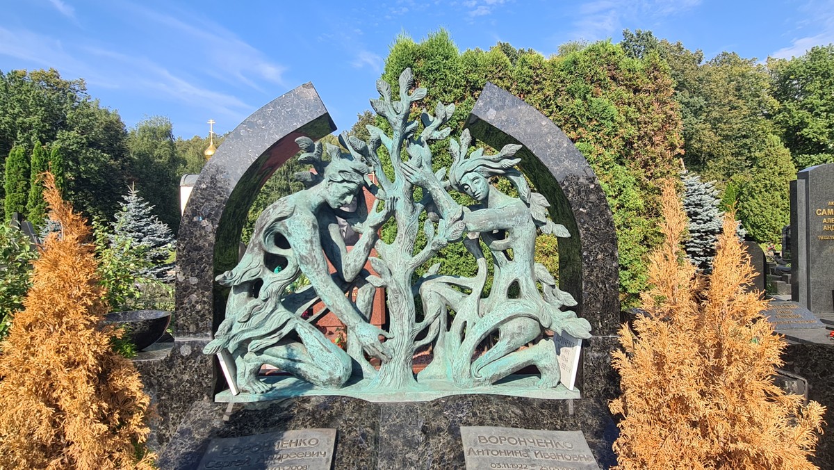 На соседнем участке памятники футболистам Тарасову и Яшину образуют импровизированный стадион: мраморные мячи очерчивают параболу, по которой экскурсовод выводит историю советского спорта от дворового поля до Олимпиад.